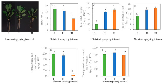 Tuscan kale grown under different NSI at harvest (A). Proline (B), total soluble sugar (C), total ascorbic acid (D) and total phenolic compounds (E) concentrations of Tuscan kale after transferring the four-week-old 5 minNSI plants to different NSIs (F) concentrations of Tuscan kale grown at different NSIs. I, 5 minNSI, II, 5 minNSI, four weeks→60 minNSI, 1 Week; III, 5 minNSI, 4 weeks→90 minNSI, 1 week. For (B–F), values are means ± standard errors. Means sharing the same letters are not significantly different from each other (p> 0.05) as determined by Tukey’s multiple comparison test (Modified from He et al. [25]).