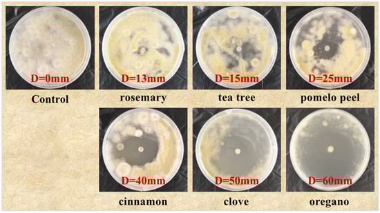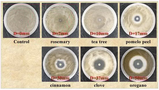 Approximately 15–20 mL of melted PDA medium was poured into a culture dish (90 mm × 20 mm), and after cooling, 200 mL of fungal suspension was evenly applied onto the PDA culture substrate. Sterile filter paper with a diameter of 5 mm was placed at the center of each culture dish, 5 μL of cinnamon, oregano, clove, tea tree, pomelo peel, and rosemary essential oil solutions were dropped on the filter paper, respectively, and then these culture dishes were covered quickly. Filter paper without adding essential oil was used as a control. The PDA plates were sealed with cling film and incubated upside down in a constant temperature incubator at 28 °C for 7 days. The diameter of the antimicrobial ring (mm) was measured using the cross-shaped method. This process was repeated three times for each essential oil in the experiment. The criterion for determining the antimicrobial effect of plant essential oils on fungal strains is that if the diameter of the antimicrobial zone (including the diameter of filter paper) is between 7 and 9 mm, this indicates low sensitivity; if it is between 10 and 15 mm, it is moderately sensitive; if the diameter is greater than 15 mm, this indicates high sensitivity; if there is no antimicrobial zone or if the diameter of the antimicrobial zone is less than 5 mm, it is considered insensitive.