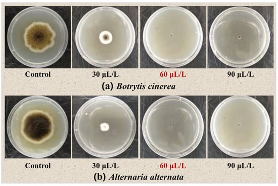 Botrytis cinerea and Alternaria alternata are the most common fungi that cause Botrytis rot disease and Alternaria rot disease in many fresh fruit and vegetables, respectively, such as strawberries [], tomatoes [], and winter jujube []. Postharvest fungal infections are mainly controlled through the use of fungicides. However, the widespread use of fungicides can not only lead to them remaining on the surface of fruits and vegetables and thus posing a threat to human health, but also is environmentally unfriendly. In recent decades, natural plant essential oils have received increasing attention as an additive for food preservation due to their non-toxic nature and excellent antimicrobial properties [,].