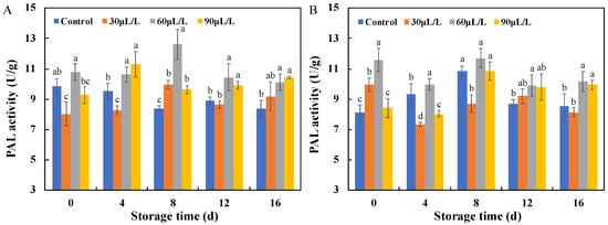 Effects of different concentrations of oregano essential oil on PAL activities of blueberries inoculated with Botrytis cinerea (A) and with Alternaria alternata (B). Values with different lowercase letter in the same time point are significantly different (p < 0.05).