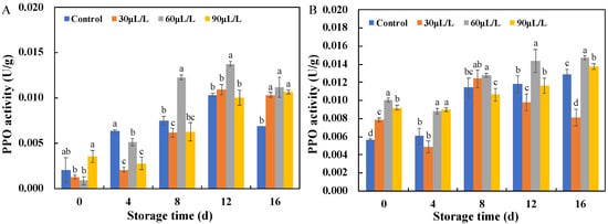 Effects of different concentrations of oregano essential oil on PPO activities of blueberries inoculated with Botrytis cinerea (A) and with Alternaria alternata (B). Values with different lowercase letter in the same time point are significantly different (p < 0.05).