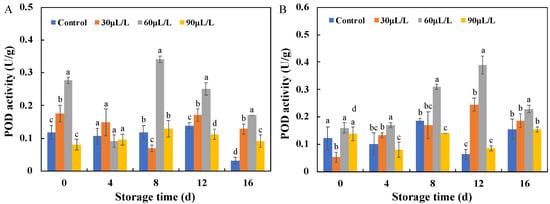 Effects of different concentrations of oregano essential oil on POD activities of blueberries inoculated with Botrytis cinerea (A) and with Alternaria alternata (B). Values with different lowercase letter in the same time point are significantly different (p < 0.05).