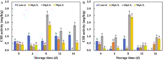 Effects of oregano essential oil treatment on CHI activities of the blueberry fruit inoculated with Botrytis cinerea (A) and Alternaria alternata (B). Values with different lowercase letter in the same time point are significantly different (p < 0.05).
