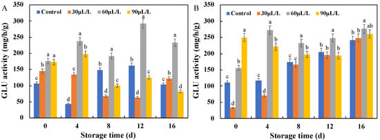 Effects of oregano essential oil treatment on GLU activities of the blueberry fruit inoculated with Botrytis cinerea (A) and Alternaria alternata (B). Values with different lowercase letter in the same time point are significantly different (p < 0.05).