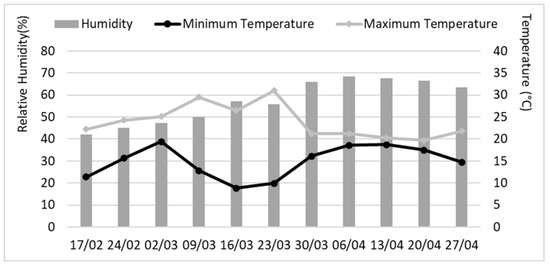 In the post-emergence test, an additional 60 disinfected seeds were individually sown in pots containing the same substrate mixture, placed in the greenhouse, and watered every 2–3 days until reaching field capacity. After one month, half of the pots received an application of 5 mL of the pathogen solution (2 × 104 CFU mL−1 of P. syringae NCPPB 1464) per plant. Twelve hours later, each plant was treated with the endophyte by spraying a dose of 1 mL of the extract (3 mg mL−1). A control treatment with 1 mL of sterilized distilled water was included. To assess treatment efficacy, disease severity was measured weekly for one month after application, based on the percentage of damaged leaves, with three leaves per plant randomly selected [40]. To quantify disease progression in each pot, the area under the disease progression curve (AUDPC) was calculated by summing the areas of the corresponding trapezoids. Each period between two consecutive measurements was considered as a unit. After the final measurement, five plants from each treatment were randomly selected for laboratory analysis, where the number and lengths of roots, as well as shoot length, were measured. Herbage and root dry weights were also determined after oven drying the samples at 60 °C until constant weight. To ensure the validity of the results, the assay was conducted simultaneously in duplicate. This experiment was carried out from 18 February to April 30, 2020. The temperature and humidity conditions recorded during both experiments mycopriming and post-emergence are shown in Figure 1.