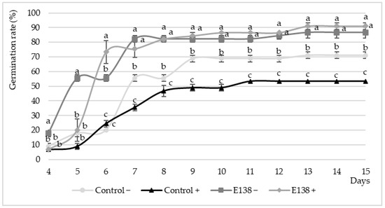Effect of endophytic extract (E138) on the germination percentage of Solanum lycopersicum seeds inoculated (+) and not inoculated (−) with Pseudomonas syringae NCPPB 1464 from 4 to 15 days after sowing (12 measurements). Values are expressed as mean (n = 3) ± standard error (error bars). In each day of measurement, different letters indicate significant differences between treatments according to the LSD (least significant difference) test at α = 0.05.