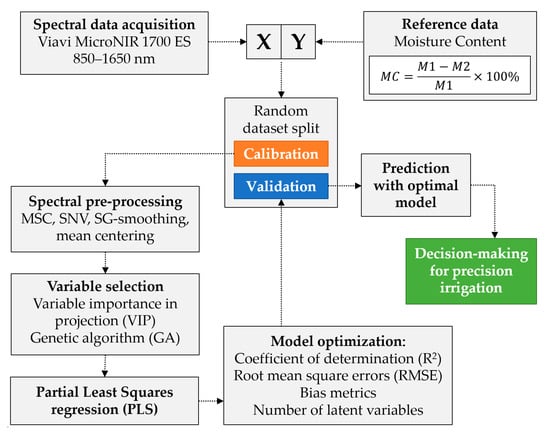 The data analysis process was performed using MATLAB software (Version R2023a, The MathWorks, Inc., Natick, MA, USA), with the PLS toolbox (Version 9.2.1, Eigenvector Research, Inc., Wenatchee, WA, USA) being employed for the development of the model. The acquired spectral and reference data were loaded into MATLAB for subsequent analysis inspired by Vitalis et al.’s [3] and Zhou et al.’s [1] studies. The dataset was divided into calibration and validation sets, with the Onion algorithm [25] employed to achieve a partition of 75% for calibration and 25% for validation.