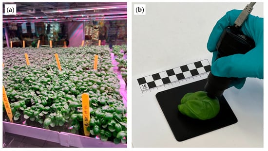 (a) Basil plants at R&D facility of Swegreen. (b) Data acquisition from basil leaves.