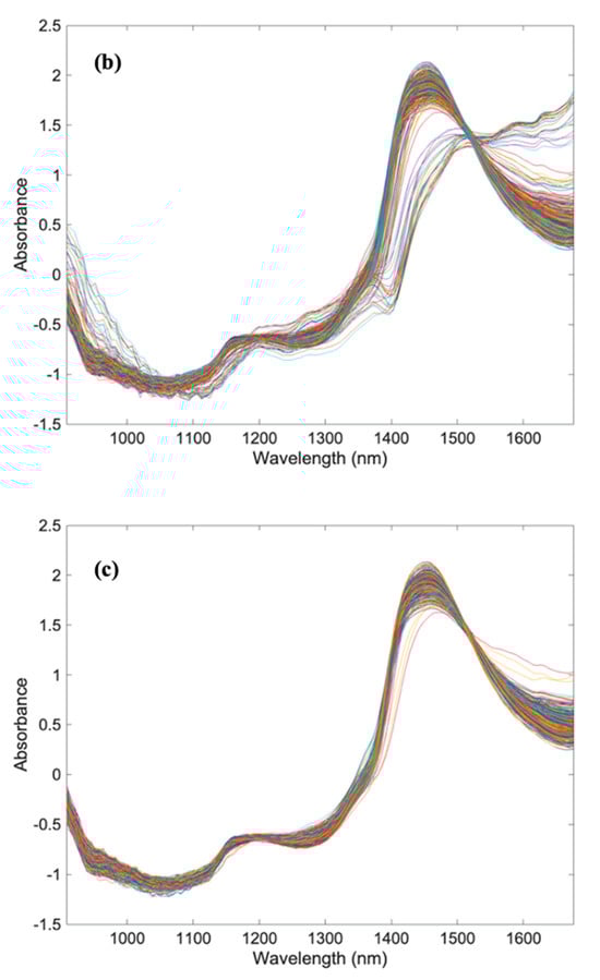 (a) Raw spectra of all basil samples. (b) Spectra after applying MSC and SNV preprocessing methods and (c) after removing extreme values. Each color corresponds to individual spectrum.