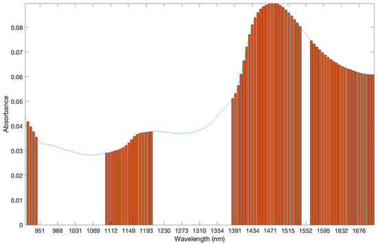Following the refinement of the dataset, the model development process continued with the comparison of two variable selection methods: GA and VIP. Through this comparison, VIP emerged as the superior method, displaying a better model fit and significantly reduced computational time. The computational time for VIP was 5 s, while GA required 16 min and 22 s to complete the variable selection process. Consequently, the final model was established based on VIP as the variable selection method (Figure 4). The selected areas identified by this algorithm aligned with the spectra of a leaf sample showing a big peak around 1470 nm and a minor peak at 1156 nm (Figure 3). These are ascribed to the stretching mode’s -OH first overtone and water bands, respectively [35,36,37]. According to Lacaze and Joffre [38], in the near-infrared and short-wave infrared regions, water exhibits four major absorption peaks at approximately 975, 1175, 1450, and 1950 nm. These wavelengths align with the approximated areas identified as significant in our VIP-selected regions and suggest a compelling association between the molecular vibrations of water and the specific spectral features deemed significant in our model.
