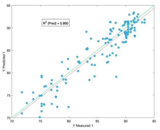The final calibration model (Figure 5), developed with eight latent variables, exhibited promising performance metrics, including improved distribution of data along the regression line. The model achieved a root mean square error of calibration (RMSEC) of 2.9908, a root mean square error of cross-validation (RMSECV) of 3.2368, and a root mean square error of prediction (RMSEP) of 2.4675. Additionally, the coefficients of determination for calibration (R2C) and cross-validation (R2CV) were 0.829 and 0.80, respectively, indicating strong consistency. The model’s predictive capability was underscored by a coefficient of determination for prediction (R2P) of 0.86. The range error ratio (RER) was used to evaluate the model’s performance [39]. Based on the American Association of Cereal Chemists [40], when RER ≥ 10, the model is acceptable for quality control, and if RER ≥ 15, the model is perfect for research quantification. The RER achieved for this model is 11.045, which indicates a high predictive performance.
