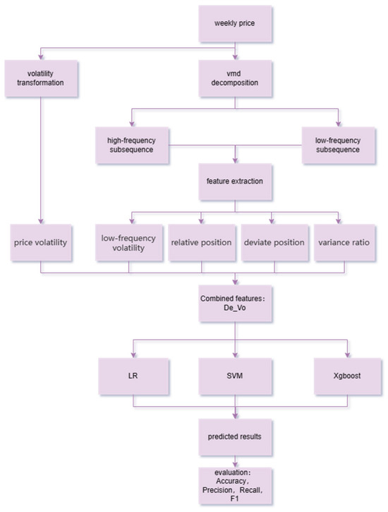 In this research, we initially conducted a volatility transformation on the weekly price data of garlic, resulting in the computation of the volatility feature, vp. Subsequently, we utilized VMD to deconstruct the weekly price data of garlic, separating the high-frequency and low-frequency signal subsequences from the original time series. Feature engineering was further applied to these decomposed subsequences, from which we extracted key informational features to assemble a feature set, designated as De. This feature set encompassed the volatility parameter vp, long-term trends lf, short-term cyclicality rp, determinate trends dp, and frequency components fc. The resulting feature set De was then integrated with the volatility feature vp to formulate an even more comprehensive feature set, De_Vo. Finally, we selected three machine learning models for our experiments, including logistic regression (LR), SVM, and XGBoost, training and validating them based on the De_Vo feature set to develop predictive models. The prediction performance of the models was quantified using an array of evaluation metrics comprising accuracy, precision, recall, and F1. By contrasting the effectiveness of different algorithms, we identified the optimal predictive model.