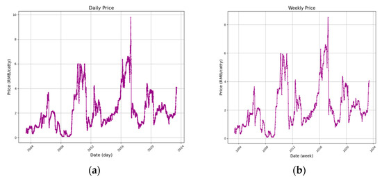 Figure 2b illustrates the processed weekly average price data of Jinxiang garlic. It can be perceived that the weekly prices present a more complete picture of the trends in the raw data.
