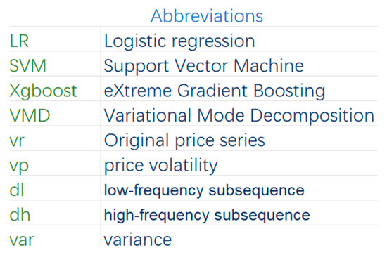 (4) The limitations or potential defects of this study are as follows. (1) This study mainly predicted the price fluctuation of garlic. The classification model selects three common classification algorithm models. From the research results, it can be seen that the prediction performance of different algorithm models exhibited large differences. Therefore, there may be more excellent algorithm models that can provide higher accuracy prediction results. When we have higher requirements for the accuracy of prediction, we can use other more suitable models for prediction. (2) The features used in this model mainly included volatility features, and four new features constructed using two sequences decomposed using VMD. Although these composite features can explain price fluctuations to a certain extent, they do not fully cover all possible factors that might affect the price. In particular, the model did not sufficiently consider key factors such as festivals, weather, and public sentiment, which could impact garlic prices. For example, in terms of the festival factor, with garlic as one of the indispensable raw materials for Chinese catering and other industries, coupled with the strong atmosphere of various Chinese festivals, garlic prices are easily affected by festival information and changes. The authors of [