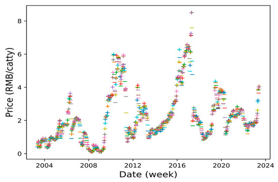 http://www.garlicbigdata.cn, accessed on 7 January 2024.) developed by the big data center of Shandong Agricultural University. The selected data were the daily price data from 22 May 2003 to 1 June 2023 for Jinxiang garlic.