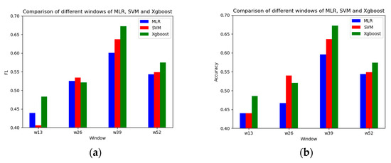 Figure 6 clearly show that when the window period was 39, the accuracy and F1 had higher values. That is, when the window period was 39, the data features constructed using the VMD decomposition results could characterize the trend of the garlic price series well.