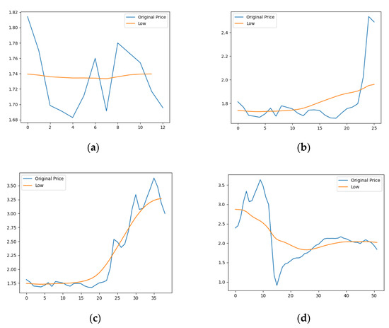 Figure 7a–d are the comparison graphs of the low-frequency part of the VMD decomposition graph and the original price series under the window scales of 13, 26, 39, and 52, respectively. It can be seen from the figure that when the window scale was 39, the low-frequency decomposition sequence could better simulate the price trend. Therefore, the window scale selected in this study was 39.