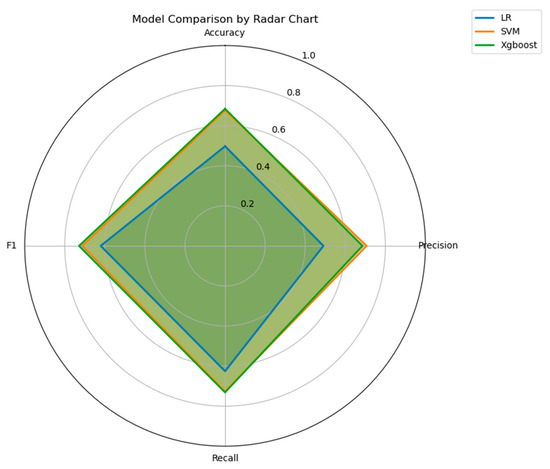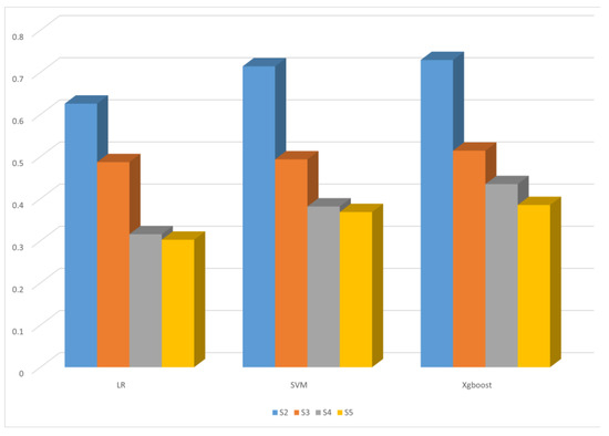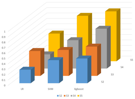 Figure 10 that the accuracy decreases gradually with the increase in the number of classification categories. Among them, from S2 to S3, the accuracy decreases the most, and the accuracy of SVM and XGBoost decreases significantly more than that of LR model. From the S3–S5 stage, the accuracy rate of XGBoost shows more prominent changes, implying that the XGBoost model has higher sensitivity to the change in the number of categories.