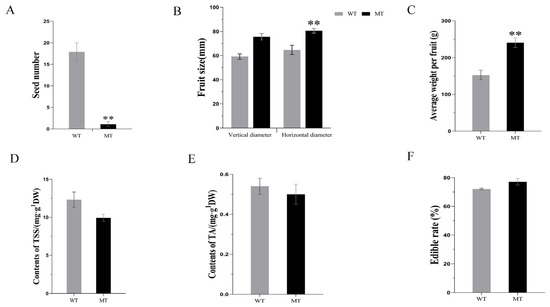 Fruit characteristics of WT and MT. Seed number per mature fruit (A); vertical and horizontal diameters of fruit (B); fruit average weight (C); fruit TSS contents (D); fruit TA contents (E); fruit edible rate (F). ** shape represents p < 0.01.
