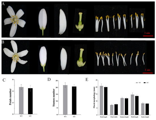Flower characteristics of (A) WT and (B) MT (bar = 1 cm); comparison of the number of petals (C); stamen number (D); petal length and width; pistil length and width (E).