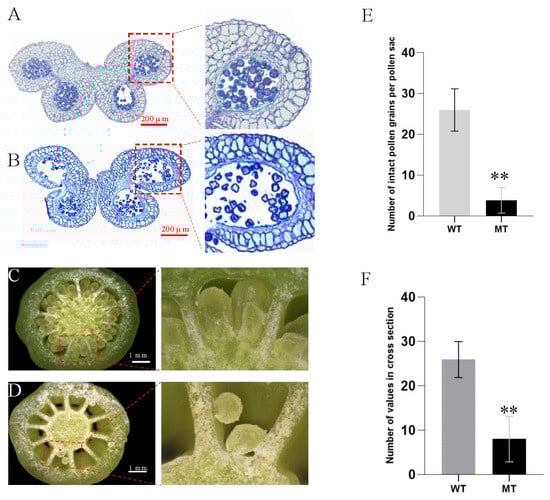 Floral dissection observation. Anther cross-section of WT (A); anther cross-section of MT (B) (bar = 200 μm); ovary cross-section of WT (C); ovary cross-section of MT (D) (bar = 1 mm); comparison of intact pollen grains per pollen sac of anther in WT and MT (E); comparison of ovules numbers in cross-sections of WT and MT (F). **, Significant at p-value < 0.01.