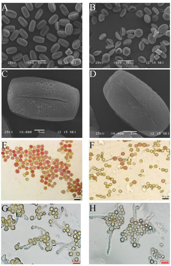 Before anthesis, ten flower buds were sampled from two cultivars, and all pollen samples were freshly harvested. Pollen micromorphology was examined using a JSM-6380LV scanning electron microscope (SEM; Jeol, Tokyo, Japan). Pollen viability and germinability were assessed through staining with 1% acetic acid magenta (w/v), which was adjusted as appropriate according to Chai [30]. In total, 200 pollen grains were investigated with an optical microscope (Zeiss Axio Imagine 2.0, Carl Zeiss AG, Jena, Germany) for each experiment. Viable pollen grains were identified as well-stained grains, while unstained or feebly stained and empty grains were classified as unviable.