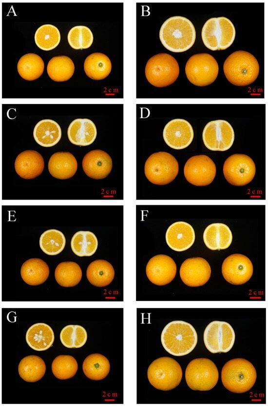 Fruit characteristics of emasculation treatment without pollination of WT (A) and MT (B); WT × WT (C); MT × MT (D); WT × MT (E); MT × WT (F); WT × ‘Dahong’ sweet orange (G); MT × ‘Dahong’ sweet orange (H). Bar = 2 cm.