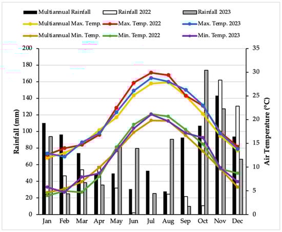 The experimental trial was carried out at Podere Rottaia, S. Piero a Grado, Pisa (43°40′33″ N 10°18′41″ E, 2 m a.s.l.) from April 2022 to September 2023 on two mature stands: one comprising Bermuda grass Cynodon dactylon × transvaalensis “Patriot” (Cd × t), and the other comprising Manila grass Zoysia matrella (L.) Merr. (Zm) cv “Diamond”. The soil texture was silty loam (28% sand, 55% silt, and 17% clay). Soil comprised 18 g kg−1 of organic matter and had a pH of 7.8. The weather exhibited a Mediterranean pattern, characterized by seasonal peaks of rainfall during spring and fall. Figure 1 shows the monthly total rainfall (mm) and mean maximum and minimum air temperatures at the experimental site for both years in which the trial was performed (2022 and 2023), together with the 10-year mean values.