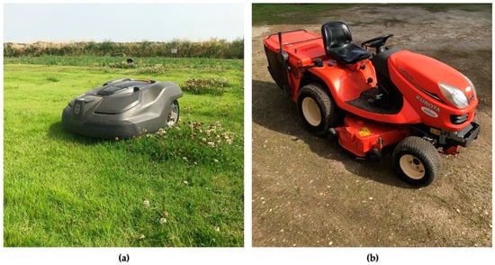 Mowers employed in the trial: (a) autonomous mower; (b) ride-on rotary mower.