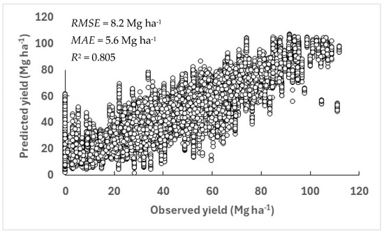 where is the observed target variable, is the predicted target variable, is the mean of observed target variables, and is the number of observations. The coefficient of determination (R2) for the relationship between predicted and observed yields was interpreted as model strength as follows [28]: R2 < 0.25, very weak; 0.25 ≤ R2 < 0.50, weak; 0.50 ≤ R2 < 0.75, moderate; R2 ≥ 0.75: substantial.
