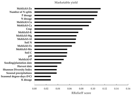 The RReliefF algorithm ranked features in order of importance for marketable yields (Figure 2). Nutrient management features such as number of N splits, N and P dosage, crop type, and seeding/plantation and harvest dates, as well as soil tests appeared to be important. Meteorological features were of lesser importance. Because all features, but irrigation that was confounded with crop type, contributed to some degree to crop yield and were easy to collect, they were included in the ML model to make yield predictions.