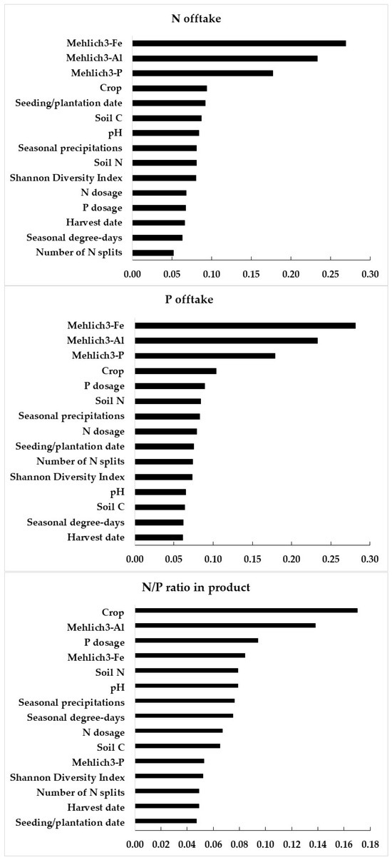 Marketable yield, N offtake, and P offtake varied widely among crops (Table 4). While the N/P mass ratios varied between 1.2 and 11.6 and overlapped across crops, 99.5% of the observations showed N/P mass ratios < 10, indicating relative N limitation or P excess. Median ratios varied little from 3.3 to 4.8 among crops. The RReliefF scores indicated that crop type, P-related features, and soil N were important features in relation to N and P offtakes and the N/P mass ratio (Figure 3), confirming the central role of P features in the N and P cycles in those vegetable agroecosystems.