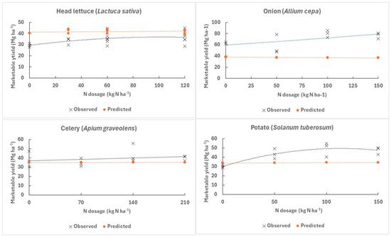 Patterns of crop responses to added N in organic soils. Predicted yields show no response. Observed yields show some response. Black dashed lines indicate plateauing. Quadratic trends for head lettuce and potato and linear trend for onion are misleading due to plateauing. Celery shows one outlier at 140 kg N ha−1 and may require additional tests.
