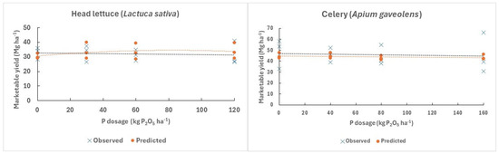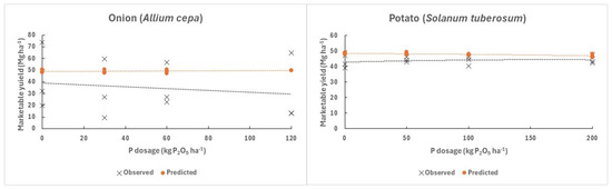 Observed and predicted crop responses to added P were negligible (Figure 5) due to high soil test P levels and soil P saturation ratios across sites. Potato, a high-P demanding crop, showed no response to added P even though the soil showed the lowest soil test P and P saturation index (Table 3). For other crops, where soil test P and the P saturation index were higher, the P fertilization was also ineffective. Hence, there was great potential to reduce the environmental footprint of P fertilization of those vegetable crops. Again, large yield variation at plot scale, especially in onion trials, indicated that factors not documented in the database, such as those causing short-distance soil variability, could have impacted crop yield. Because the database was relatively small, more trials and universality tests are needed.