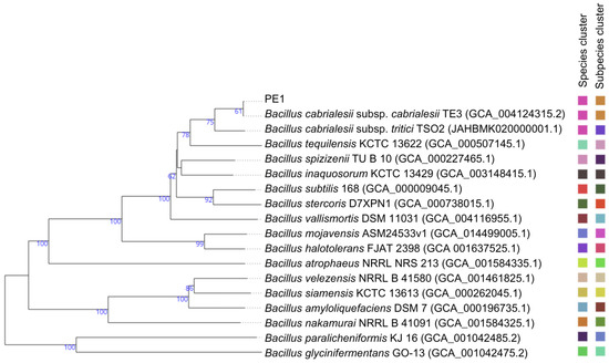 The Illumina NovaSeq platform (2 × 250 bp) was used for DNA sequencing, and library preparation was carried out using the Nextera XT Library Prep Kit, following the manufacturer’s protocol, but with the following modifications: input DNA was increased 2-fold, and PCR elongation time was increased to 45 s. DNA quantification and library preparation were carried out on a Hamilton Microlab STAR automated liquid handling system (Hamilton Bonaduz AG, Reno, Nevada, USA). Libraries were sequenced on an Illumina NovaSeq 6000 (Illumina, San Diego, CA, USA), using a 250 bp paired-end protocol. Genomic information analysis was performed following the workflow reported by Ortega-Urquieta, 2022 [26]. Trimmomatic version 0.30 was used to remove adapter sequences and eliminate low-quality bases. The SPAdes version 3.15.4 generated a de novo assembly, and the contigs were ordered regarding the genome of Bacillus cabrialesii subsp. cabrialesii TE3T (GenBank accession number GCA_004124315.2), using Mauve Contig Mover version 2.4.0. Plasmid detection was performed with PlasmidFinder 2.1. The genome sequence of strain PE1 was analyzed for contamination using CheckM version 1.0.18 [27].