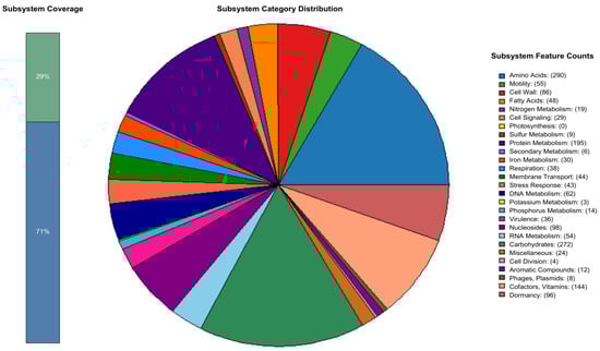 According to the RAST prediction, the genome of B. cabrialesii subsp. cabrialesii PE1 contains 94 RNA sequences and 4261 protein-coding DNA sequences (CDSs) distributed across 331 subsystems, as shown in Figure 2. Notable subsystems in the genome of strain PE1 include coding sequences related to biocontrol, such as virulence, disease, and defense (36 CDSs). These are further subdivided into resistance to antibiotics and toxic compounds, invasion and intracellular resistance, and bacteriocins and ribosomally synthesized antibacterial peptides. Additionally, the iron acquisition and metabolism (30 CDSs) subsystem includes genes related to siderophores, which function as iron chelators, decreasing the accessibility of iron to phytopathogenic microorganisms. The carbohydrates subsystem (272 CDSs) contains coding sequences related to the production of acetoin and butanediol. These volatile components are capable of inducing systemic resistance in plants [37]. The cell wall and capsule (86 CDSs) subsystem contains coding sequences for exopolysaccharide biosynthesis (EpsC and EpsD), which are genes related to colonization [22]. Additionally, subsystems related to bacterial resilience for the development of agricultural bioproducts were identified, including the stress response (43 CDSs), which covers osmotic and oxidative stress. Furthermore, complementing these results, the circular chromosome map based on Prokka predicted a total of 5395 CDSs, 130 tRNAs, and 1 tmRNA (Figure 3).