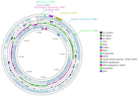 Circular chromosome map of Bacillus cabrialesii subsp. cabrialesii PE1, including the distribution of CDS, tRNAs, rRNAs, and GC content skew generated through genome annotation from PROKKA. Additionally, the identified biosynthetic gene clusters associated with biocontrol by AntiSMASH [30] are also shown.