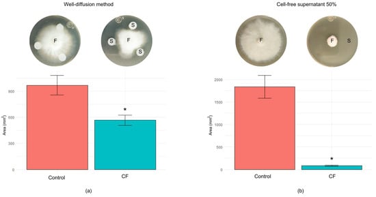 Antagonistic activity of extracellular metabolites from B. cabrialesii subsp. cabrialesii PE1 against F. languescens CE2 in PDA: (a) well-diffusion method, 3 days of incubation; and (b) cell-free supernatant 50% v/v, 6 days of incubation. The antagonistic effect of the cell-free supernatant on F. languescens CE2 mycelial growth was measured in terms of area (mm2). * Statistically significant difference (p ≤ 0.05). F: F. languescens CE2. S: cell-free supernatant from B. cabrialesii subsp. cabrialesii PE1.