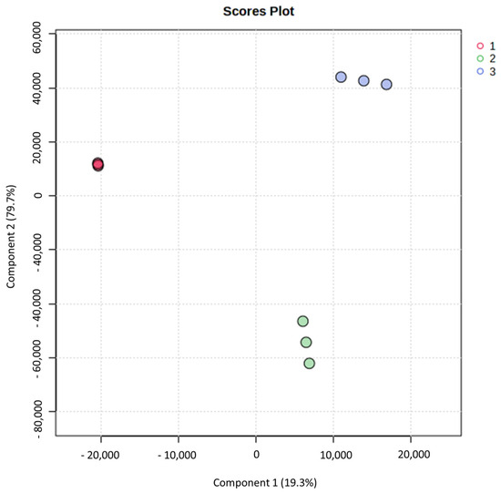 Principal Component Analysis (PCA) graph of three late-season mandarin varieties (1. ‘Afourer’; 2. ‘Orri’; 3. ‘Tango’).