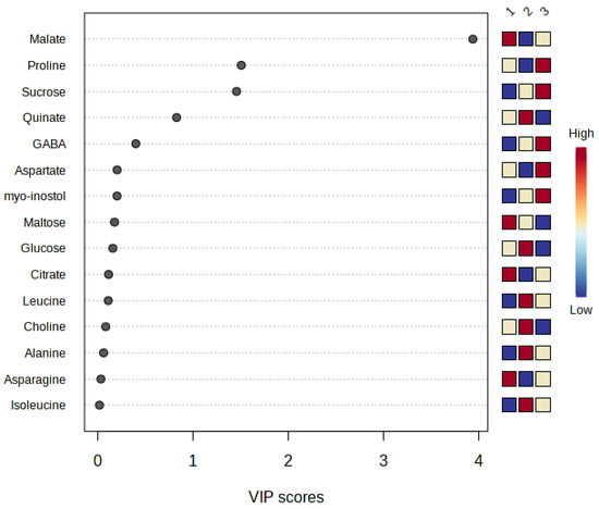 Using PLS-DA (Partial Least Squares-Discriminant Analysis) regression, the VIP (Variable Importance in Projection) was estimated, which shows us which metabolites are significant and differentiating among the three mandarin varieties [58,59]. The results (Figure 2) show that only malate, proline, and sucrose were the metabolites that had a VIP greater than 1, so these compounds had the highest significant differences among the three varieties.