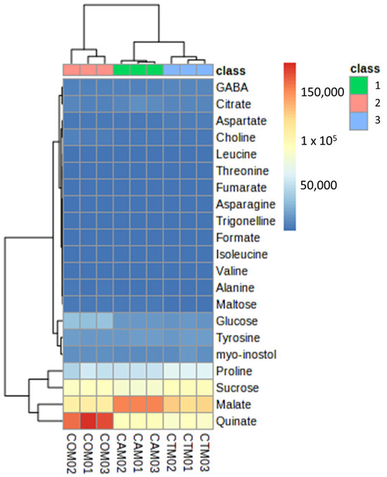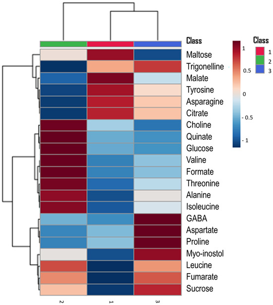 On the other hand, the hierarchical clustering heatmap shows visually with a color scale the relative concentrations of each of the detected metabolites [60]. The heatmap (Figure 3) showed that the ‘Orri’ variety was characterized by higher amounts of the metabolites choline, quinate, and formate acids, as well as the sugar glucose and the amino acids threonine, alanine, or isoleucine. The ‘Afourer’ variety was characterized by a higher concentration of malate and citrate acids, maltose sugar, and the amino acids asparagine and tyrosine. The ‘Tango’ variety was characterized by higher concentrations of the amino acids GABA, aspartate, and proline.