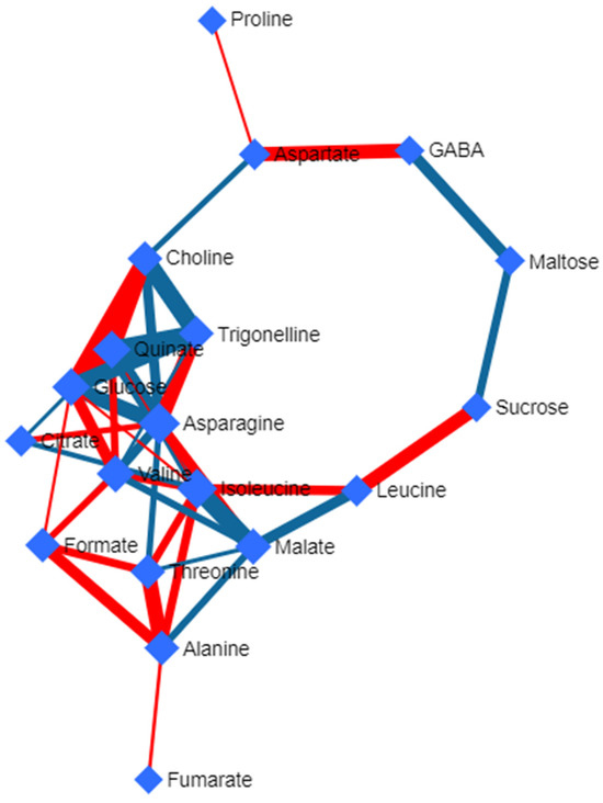 Analysis of the metabolic pathways was carried out by applying the Deviated Scattered Partial Correlation (DSPC) algorithm to the results obtained in 1H NMR. This algorithm was formulated by Janková and van de Geer [58] using graphical loop modeling. This analysis allows us to graphically identify the correlation between different metabolites present in the leaf samples to be analyzed [62]. The graphical model (Figure 5) represents the metabolites in a weighted node network, where the partial correlation coefficients and p-values of each pair of metabolites that are correlated by metabolic pathways are represented. Two nodes joined by a red line represent a positive relationship, while those joined by a blue line represent a negative relationship.