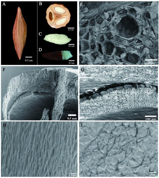 This figure presents the morphological characteristics of Chinese olive seeds. (A) shows complete seeds. (B) depicts a cross-section of a seed. (C) displays a view of a mature embryo. (D) illustrates an embryo with the seed coat. (E) provides a magnified view (×500) of the inner surface of the fruit coat (testa). (F) shows a cross-section of the endocarp (×30). (G) offers a closer look (×200) at the endocarp. (H,I) show the seed coat at higher magnifications (×400).