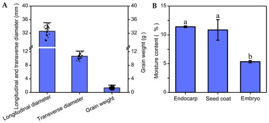 The average single seed weight, longitudinal diameter, and width of Chinese olive seeds were found to be 1.33 g, 32.96 mm, and 10.65 mm, respectively (Figure 2A). The water content of the endocarp (i.e., seed shell), seed coat, and embryo was measured to be 11.4%, 10.85%, and 5.33%, respectively. It was observed that the embryo had a significantly lower water content compared to the seed shell and testa (p < 0.05) (Figure 2B).