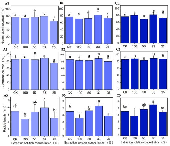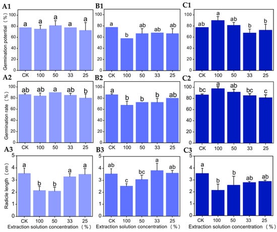 The germination potential and germination rate of Chinese cabbage seeds treated with pure water extracts of the endocarp, seed coat, and embryo were not significantly different from the control group (CK) (p > 0.05) (Figure 4A1–C1,A2–C2). However, there were varying degrees of difference in radicle growth. The radicle length of Chinese cabbage treated with an 100% extract from different parts was lower than that of the control group, and the difference between the 100% extract of the endocarp and embryo and the control group was not significant (p > 0.05). The 100% extract of the seed coat was significantly lower than that of the control group (p < 0.05). In the concentration range of 50–100%, the inhibitory effect on radicle growth gradually decreased with decreasing concentration. At a concentration of 33%, it had a significant promoting effect on radicle growth. When the concentration was lower than 25%, the inhibition or effect was relieved (Figure 4A3–C3). In summary, the pure aqueous extract of Chinese olive seeds had no significant effect on the germination of Chinese cabbage seeds. However, it did have an effect on radicle growth, which varied at different concentrations.