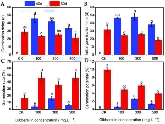 Effects of gibberellin combined with low-temperature stratification on germination delay (A), initial germination time (B), germination rate (C), and germination potential (D) of Chinese olive seeds. The blue and red bars represent 40 and 60 days of cold stratification, respectively. Different letters indicate significant differences among means (least significant difference test, p < 0.05). Error bars depict standard errors of the means.