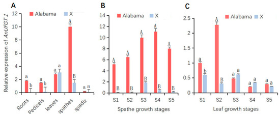 Gene expression patterns of AnUFGT1 in ‘Alabama’ and ‘X’. The expression patterns detected by real-time quantitative PCR. Red represents ‘Alabama’, and blue represents ‘X’. (A) Expression levels of AnUFGT1 in different organs. There were highly significant differences in roots, pedicels, and spathes between ‘Alabama’ and ‘X’. (B) Expression levels of AnUFGT1 in spathes at different growth stages. There were highly significant differences from S1 to S5 between ‘Alabama’ and ‘X’. (C) Expression levels of AnUFGT1 in leaves at different growth stages. Capital letters A and B in (A–C) indicate a significant difference at the α = 0.01 level; lowercase letters a and b indicate a significant difference at the α = 0.05 level.