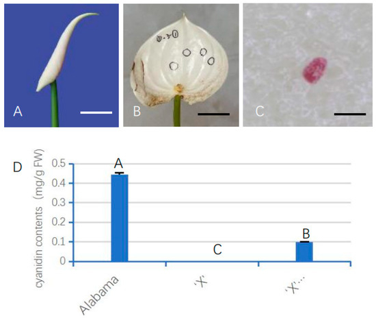 Phenotype of ‘X’ 35S::AnUFGT1. (A) Young spathe of ‘Xueye’, which is used for injection transformation. (B) The spathe unfolded after injection. The meat panicle is removed. The black circles show where the red spots are. (C) One red spot on a transgenic ‘X’ spathe. (D) Cyaniding contents of ‘Alabama’, ‘X’ and ‘X’ 35S::AnUFGT1. The data showed that the red spots were due to the accumulation of anthocyanins. The bar in (A,B) represents 2 cm. The bar in (C) represents 50 μm. Capital letters A, B, and C in (D) indicate a significant difference at the α = 0.01 level.
