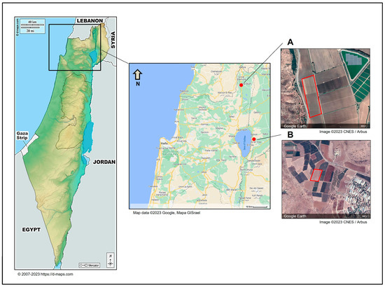 The locations of sampling sites in northeastern Israel. Onion samples were collected from two representative commercial fields in northeast Israel. The sampled fields were Kibbutz Yiron (Galilee, Hula Valley, (A)) and Givat Yoav (Golan Heights, (B)), highlighted by red boxes. The Givat Yoav field was also used for a survey evaluating disease severity. According to d-maps.com (accessed on 1 April 2024) and the Google Maps/Google Earth (https://www.google.com/intl/en_GB/help/terms_maps/, accessed on 1 April 2024) Terms of Service, the maps and photos can be used and adapted. The map of Israel is from https://d-maps.com/pays.php?num_pay=88&lang=en (accessed on 1 April 2024).