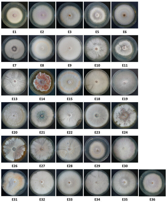 Thirty-one Fusarium isolate colonies from onions collected from the Givat Yoav (Golan Heights, E1–E11) and Kibbutz Yiron (Galilee, Hula Valley, E13–E36) fields (see Figure 1). Isolates were selected from 228 according to colony and spore characteristics. Some isolate numbers are missing because they were identified as different species than Fusarium. That is why 31 isolates are presented, while some have a higher number (E32–E36). Colonies were grown in the dark for six days on a rich solid medium (PDA) at 28 ± 1 °C.